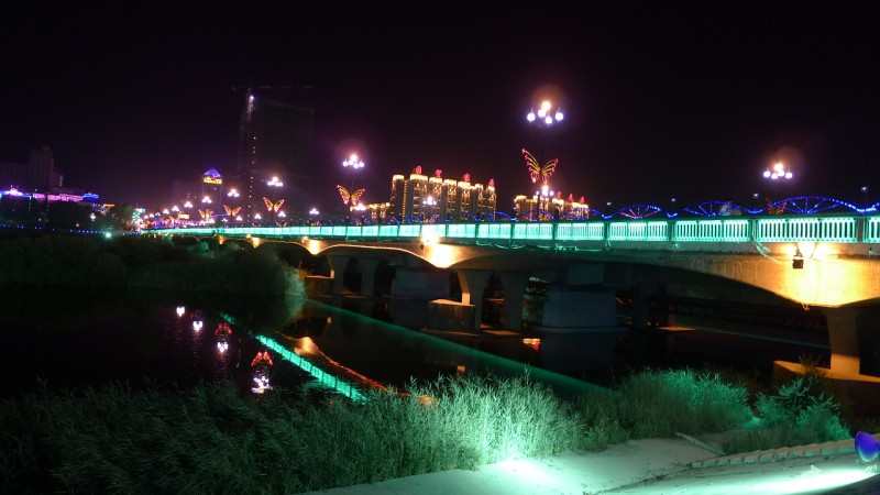 入住海拉尔宾馆,这回没有着急找游泳池,估计找也没有用。吃完了蒙古包里的牛羊肉,带着东东安琪林珊暴走去了。事前已经从小李那里知道,宾馆就在伊敏河旁边,出门过桥可以看夜景。政府耗资巨大打造的夜景工程据说很好看。