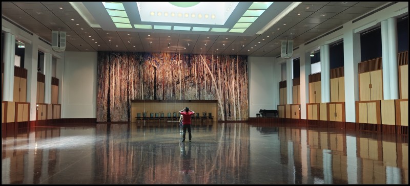 我们走进澳大利亚国会大厦的中央大厅,正面悬挂世界最大的挂毯《澳大利亚之林》(20米×19米),用于国宴和重要活动。这幅挂毯基于澳大利亚艺术家亚瑟·博伊德(Arthur Boyd)的油画作品复制而成,由13名织工历时两年多完成。博伊德是20世纪中后期澳大利亚重要画家,挂毯远看像一片茂密的桉树林,融合印象派风景与表现主义元素,以抽象的艺术体现了博伊德对澳大利亚历史与文化的深刻表达。