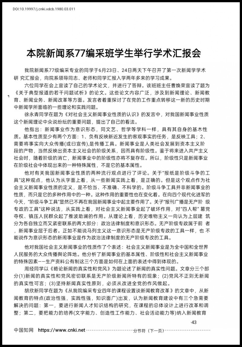 发言之后,出现了分歧极大的观点,说好的有之,也有极端说法,一言以蔽之,就是“反党”二字。那个时候年青,刚刚从文革时代走出来,所以我对反不反都无所谓。之后有领导提出把全文正式发表,我赶紧让当时女朋友抄写了一遍,准备送出去的时候又遇到了另外一位曹老师,她说,别拿去发表了,因为有人想到把它当成靶子。我听了就把它压在箱底,至今没有全文刊出。坛子上登出的,仅是当年的学报的会议纪要,作者亦谈就是徐同学。知网也做了收录,算不算C刊业绩,那就天知道了。