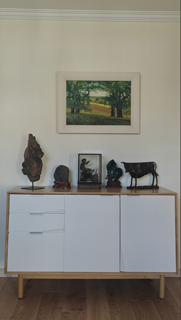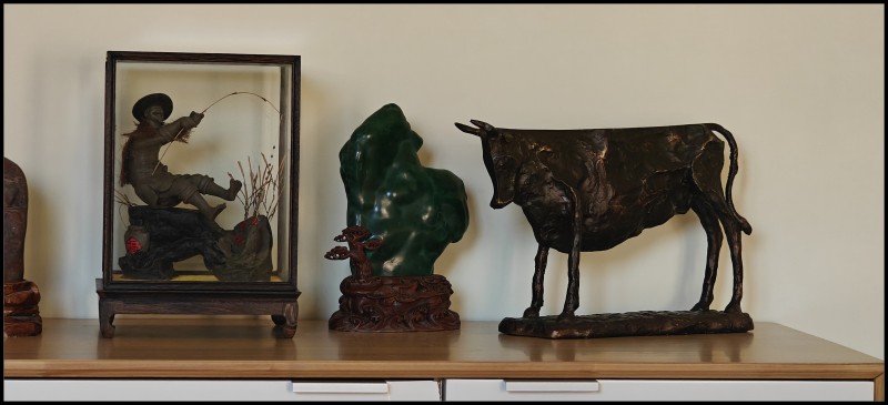 牛马摆件一并打包从澳洲运回北京,开包那天发现,木头马健康,那牛尾巴断了,这时发现,黑牛不是金属的,石膏造的。老婆急得落泪,痛惜她那断尾牛。负责货运的任老实说,我沾上我沾上,他买来了沾鞋用的502,沾上了,也摆上了,谁也看不出此牛断尾,但我心里知道,每每看到就心里说啊呀,断尾的。