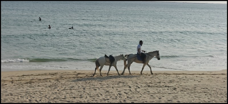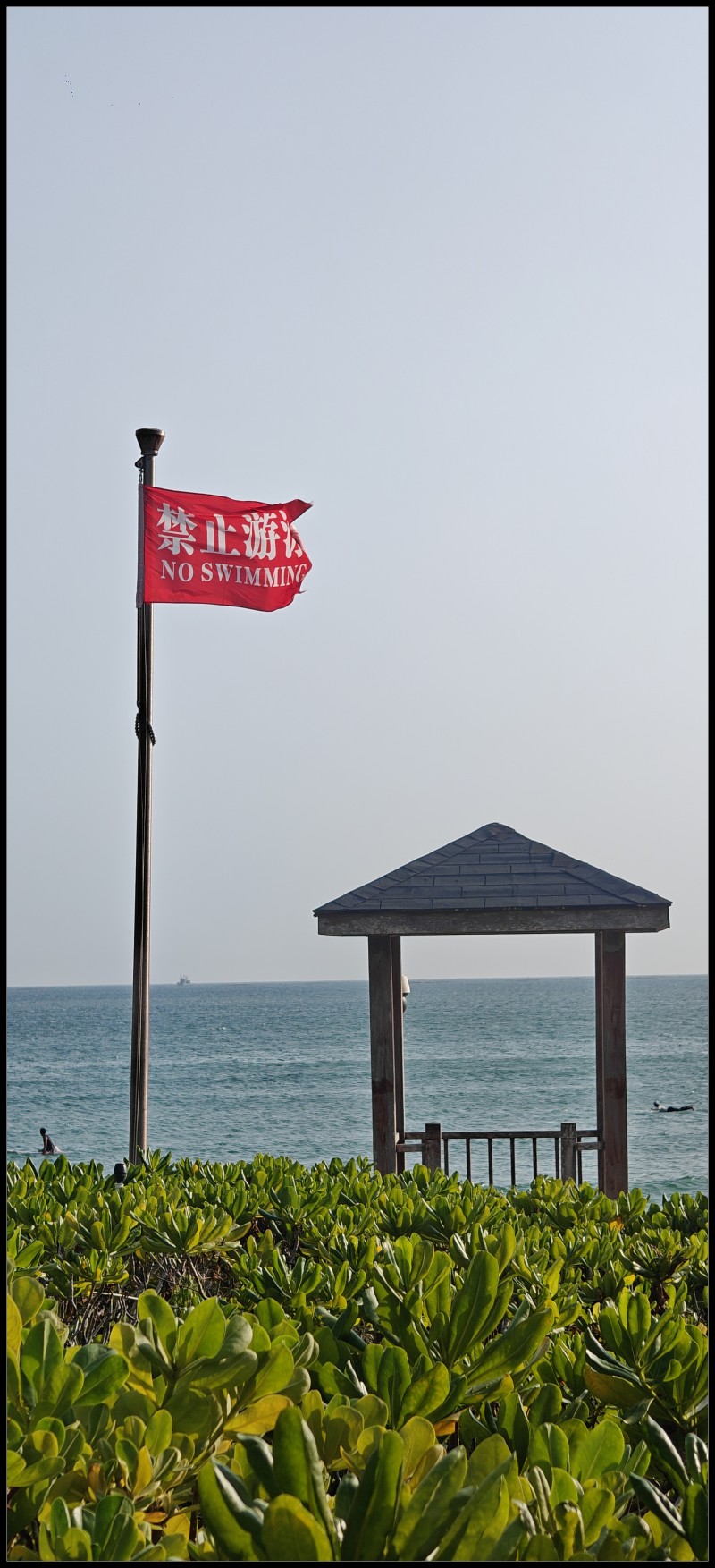 抵达陵水,当天就去清水湾,那里星际酒店正在做女子高尔夫大师赛,我不懂球,也没有票,只能绕道酒店大堂直达海边,迎面就看到禁止游泳的小红旗。风高浪急,还是有勇者在冲浪,还有骑手走海边,一看就知道那是商业摆拍的。