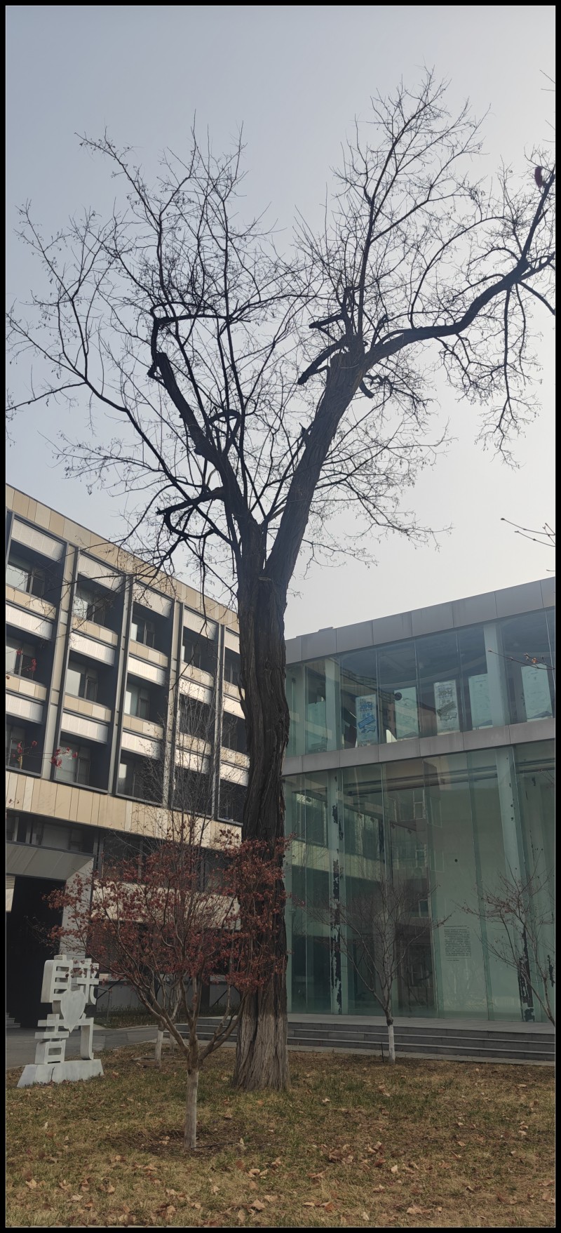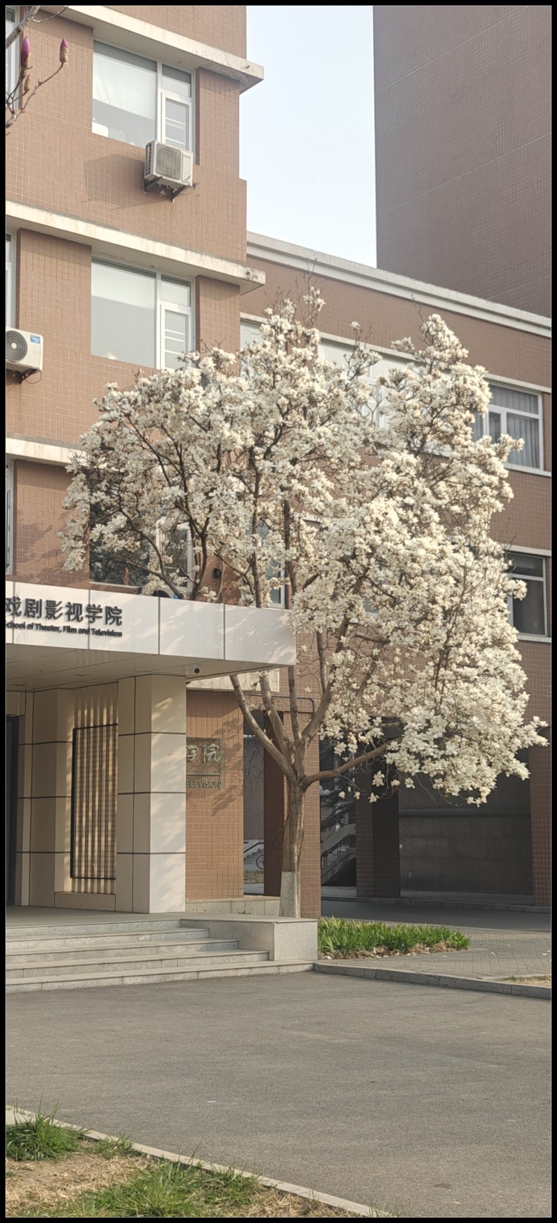 那座西配楼,玉兰花也绽放了。路过核桃林,觉得核桃树长大了不少,而且,顺直了。恶俗雕像背后就是一号楼,特意咔嚓一张,七七当年上课的地方。