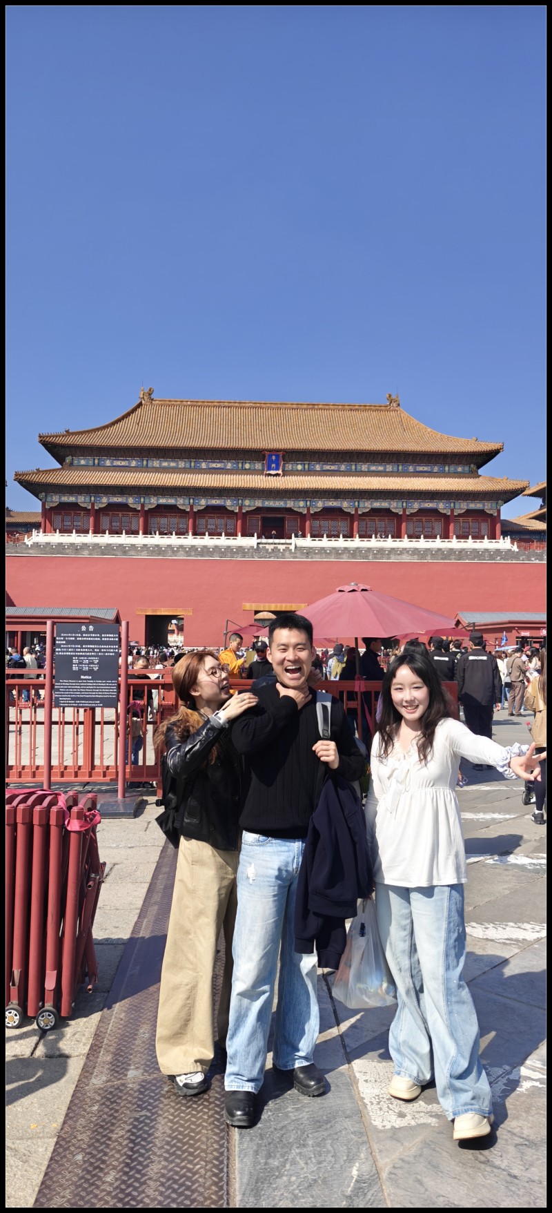 出门就是角楼,这也是我最爱。每次一发角楼照片,朋友圈就有很多的点赞。角楼过去就是南长街,西边中南海东边故宫,正中就是午门。以前毕业季带过小白小宋来留影,这回硕三三人合照,装神弄鬼。留影之后本来打算从后身进入天安门,但守卫告知,不可逆行。 重回午门东行,入劳动人民文化宫,看看太庙,再到天安门东站,结束这次的愚人游。