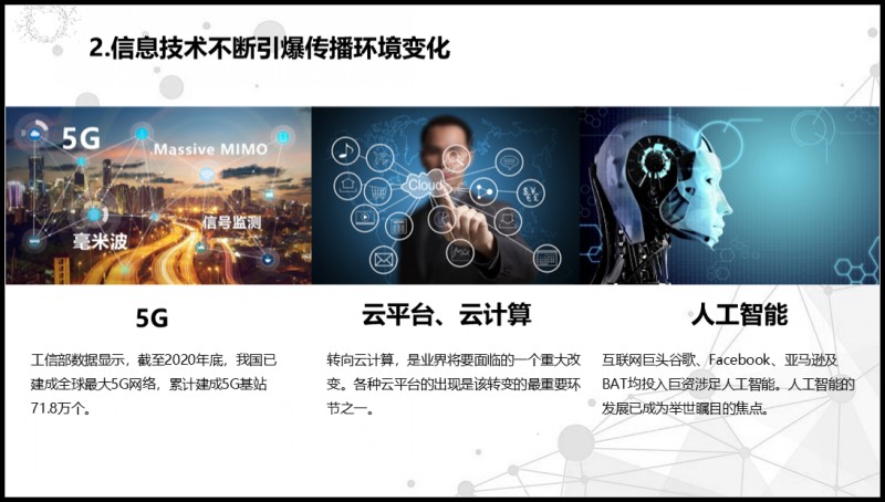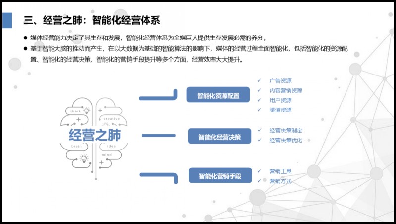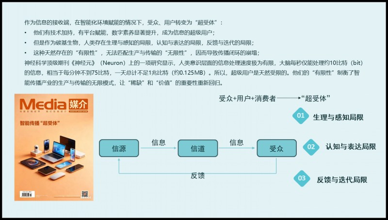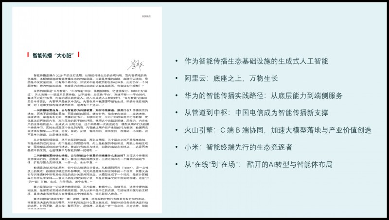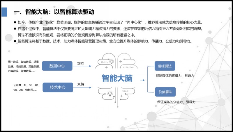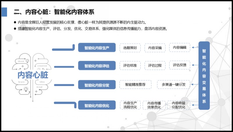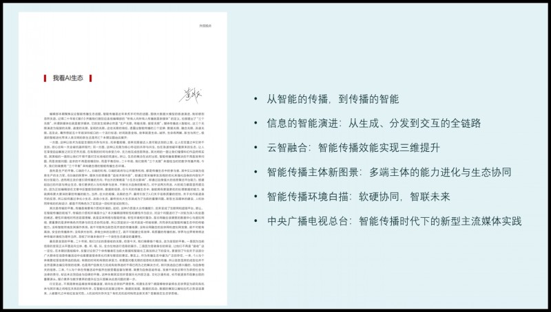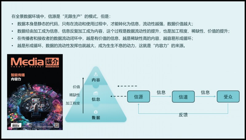 视点:综上,我们可以重新梳理智能传播的产业链路了。智能传播的基座是不可穷尽的数据源,被加工处理的数据上升为信息并开始具有流动性。信息的进一步加工嵌入了人与人的传播闭环且具备高速流动性,形成我们所说的“内容”。而内容作为智能传播产业链路上最有可能触摸到用户心智的环节,天然具备影响人心的巨大作用力。不管算法和AI如何发展,真正能够触达心智、影响决策的,永远是那些精准高效传播的、有温度的内容。这也使得内容得以成为整个智能传播产业中的龙头角色。