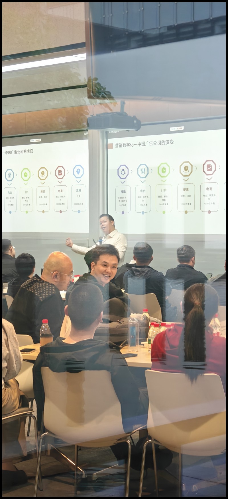 晚宴有学生招呼,缺席了。出去路过湖畔创研中心的教室,发现玻璃墙后的教室正在进行广告业务讲座。
