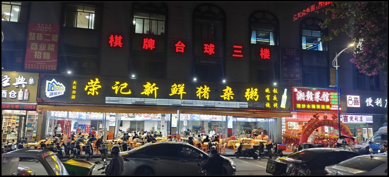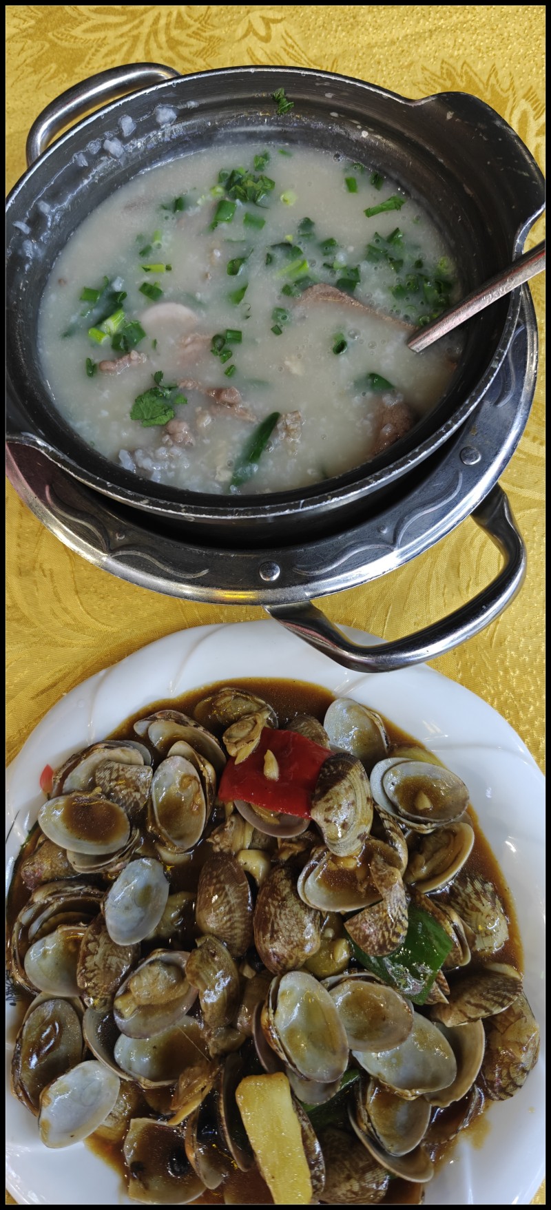 回家正好五点半,去哪?不约而同想到江边那个猪杂粥,就去那吧,大排档味道好。一路过去万步完成且超标,快两万了。点了一份猪杂粥,一份捞粉,一碟炒花甲,再加一碟青菜97元。