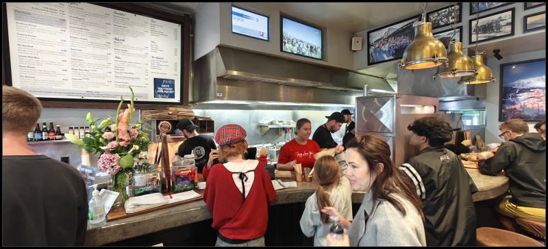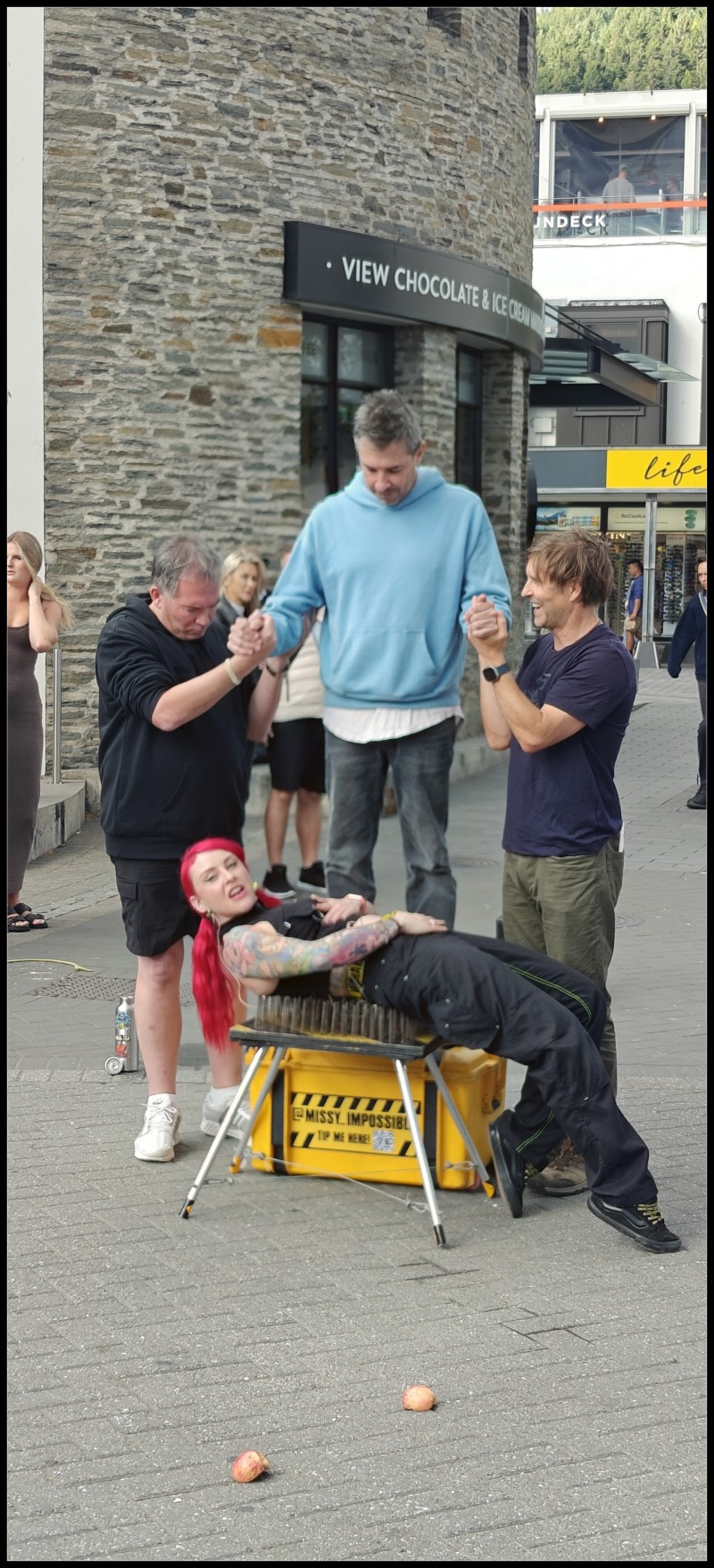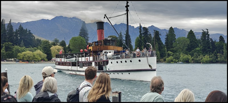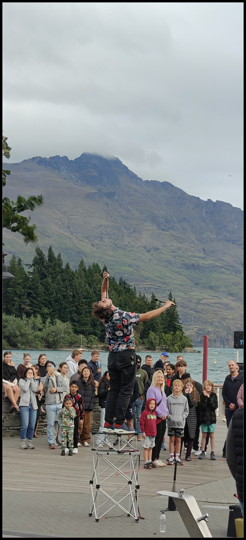 花花世界皇后镇,好山好水好热闹,二十万居民二百万的客,一艘百年火轮,两条半商业大街,日夜排队不止的大脸汉堡,还有,刚刚躺完钢钉床,马上又有吞刀剑的码头广场,咖啡居然喝到天上,天上!