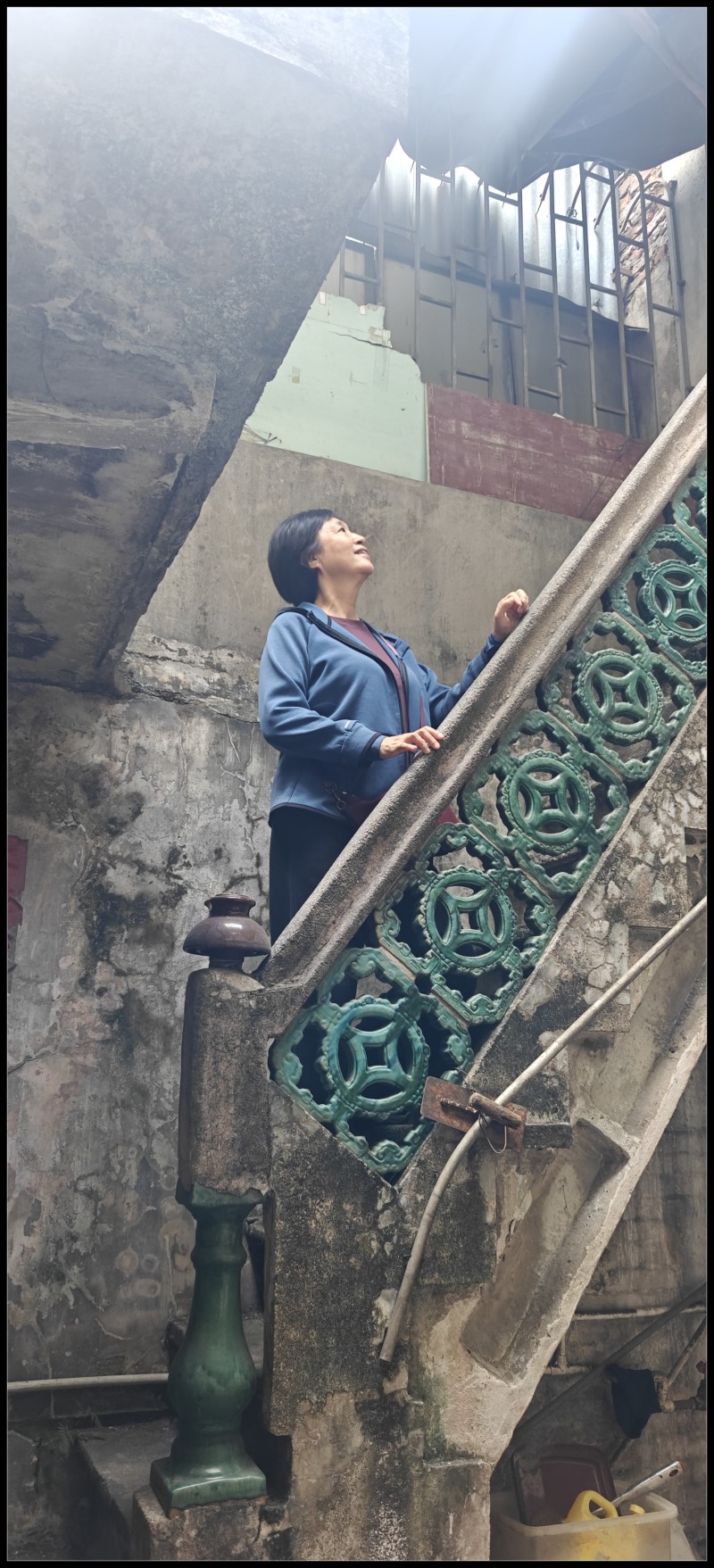 而后,又到青年路的老街看老妈生活过的旧居。老婆四十多年前也曾住过,她记得这座青色琉璃瓦楼梯。再以前没有楼梯,只是大屋,屋前有鱼塘,屋旁有农田。大哥提起,他四岁那年在吃晚饭的时候家里突然出现一位陌生人,母亲接到一张纸条便马上起身,带着大哥连夜逃往香港。据老妹回忆文说,那时的老屋其实是地下党的交通站,来者就是交通员,纸条所示:危险出走。