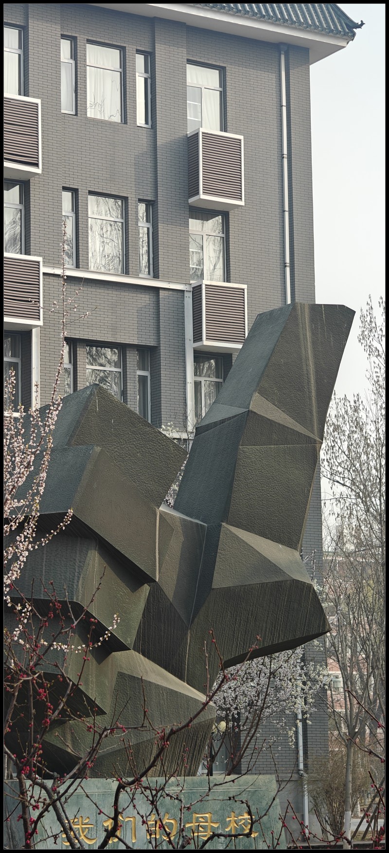 那座西配楼,玉兰花也绽放了。路过核桃林,觉得核桃树长大了不少,而且,顺直了。恶俗雕像背后就是一号楼,特意咔嚓一张,七七当年上课的地方。