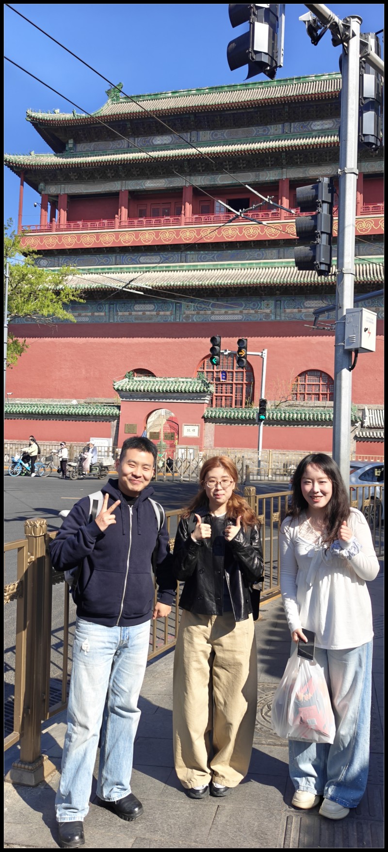 出门就是角楼,这也是我最爱。每次一发角楼照片,朋友圈就有很多的点赞。角楼过去就是南长街,西边中南海东边故宫,正中就是午门。以前毕业季带过小白小宋来留影,这回硕三三人合照,装神弄鬼。留影之后本来打算从后身进入天安门,但守卫告知,不可逆行。 重回午门东行,入劳动人民文化宫,看看太庙,再到天安门东站,结束这次的愚人游。